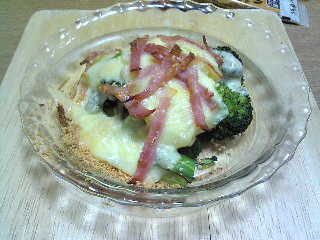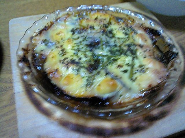 ジャガイモと3種類のチーズをのせてグリルしたものです。